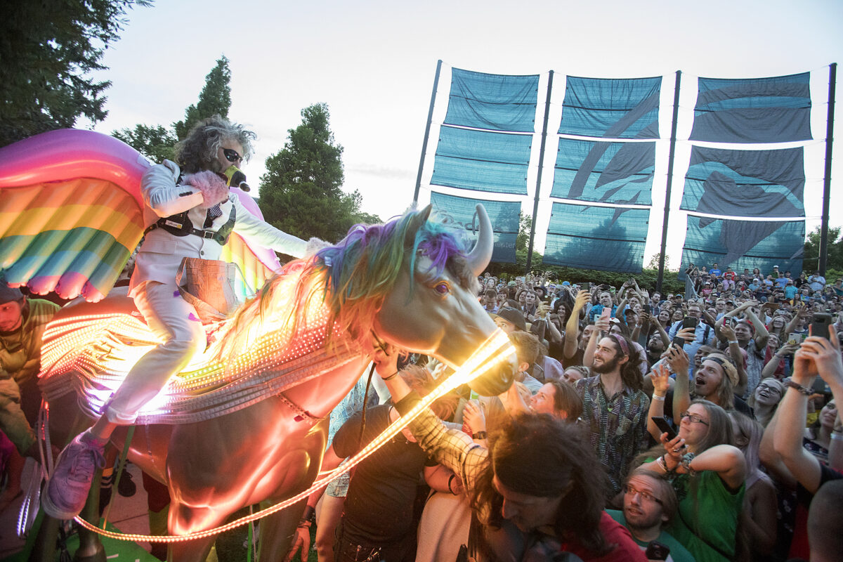 Wayne Coyne of The Flaming Lips rides through the crowd on a rolling unicorn as his band opens up the 2018 Ogden Twilight Concert Series at the Ogden Amphitheater on Thursday, June 7, 2018.