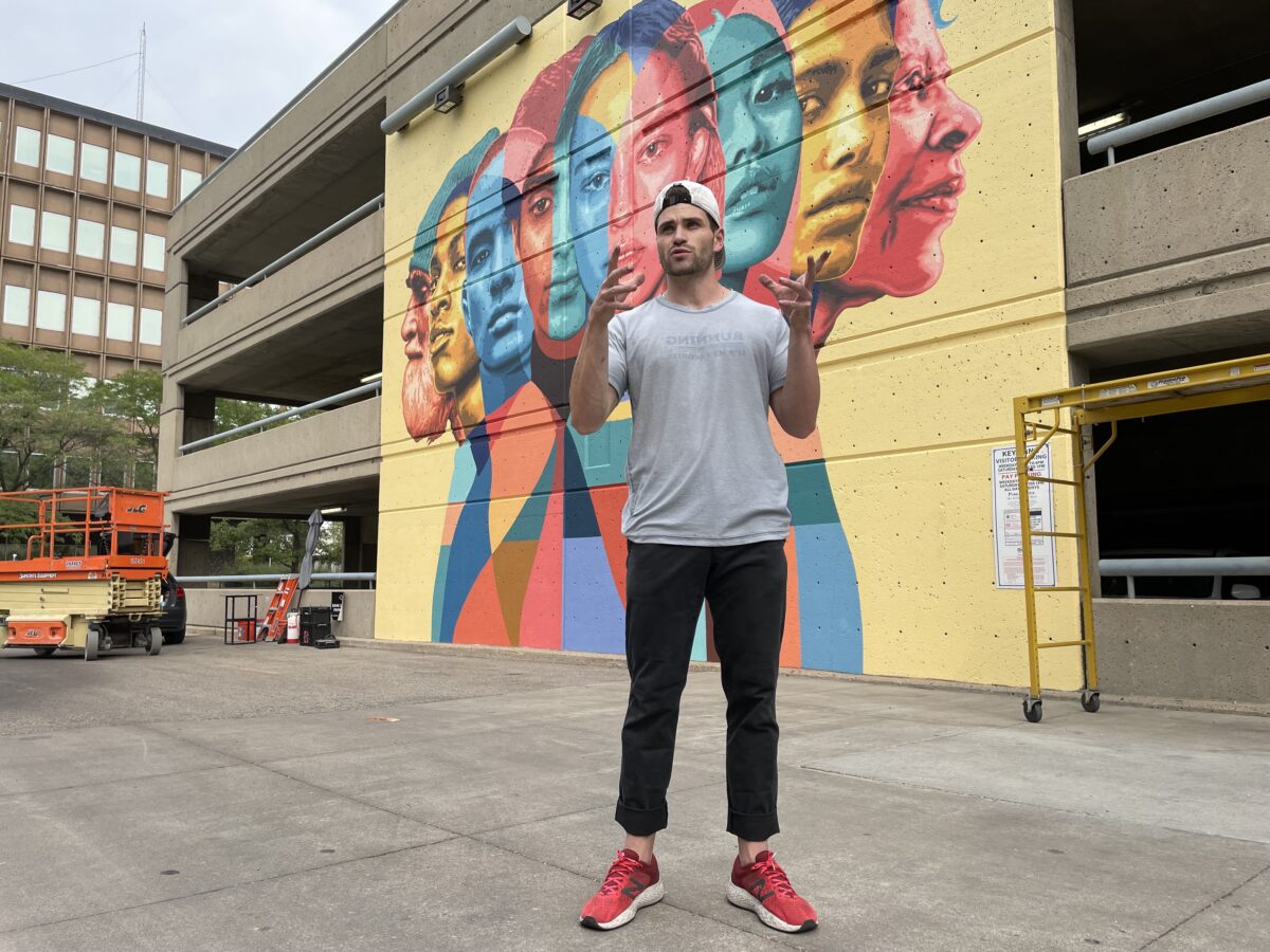 Artist Cole Eisenhour talks about his mural, "You Belong," on a parking garage off 25th Street in Ogden on Aug. 17, 2021. (Photo by Tim Vandenack, Standard-Examiner)