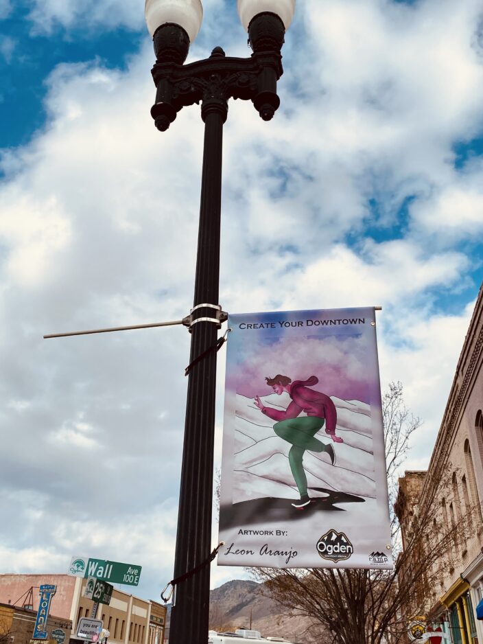 - Artwork by Leon Araujo is displayed on ODA’s new spring banners hanging on light fixtures all over downtown Ogden.