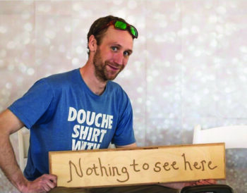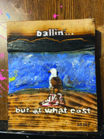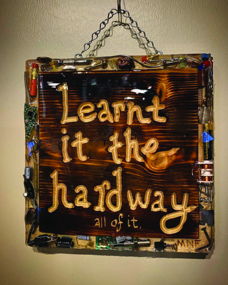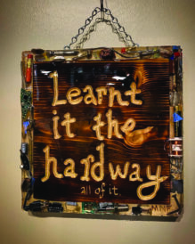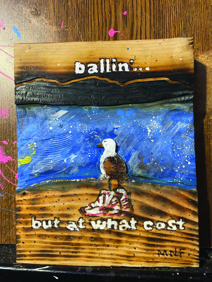 A cyclist for most of his life, Fletcher says he has always been a maker using found objects to make things, mostly bike ramps. After his grandfather passed, Fletcher inherited some wood-burning tools. “I started doodling up smart-ass signs for my yard on scrap wood. Always just for fun,” Fletcher said. His friend suggested Fletcher display his signs in a gallery, but Fletcher scoffed at the idea. “At the time, I didn’t know what I’d display. My house was my canvas and I couldn’t put that in a museum.”