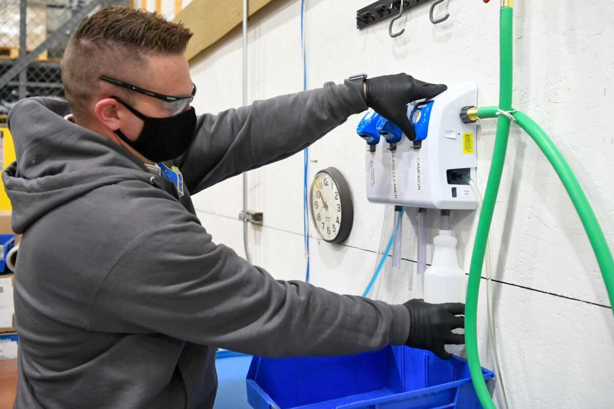 Jeremy Stewart, 309th Maintenance Support Group hazmat shop supervisor, fills up spray bottles with cleaning disinfectant for the group's workspaces, June 18, 2020, at Hill Air Force Base, Utah. The group has become the central supplier for the entire Ogden Air Logistics Complex in terms of necessary items such as masks, hand sanitizer and disinfectant. (U.S. Air Force photo by Cynthia Griggs)