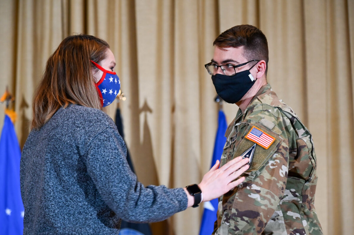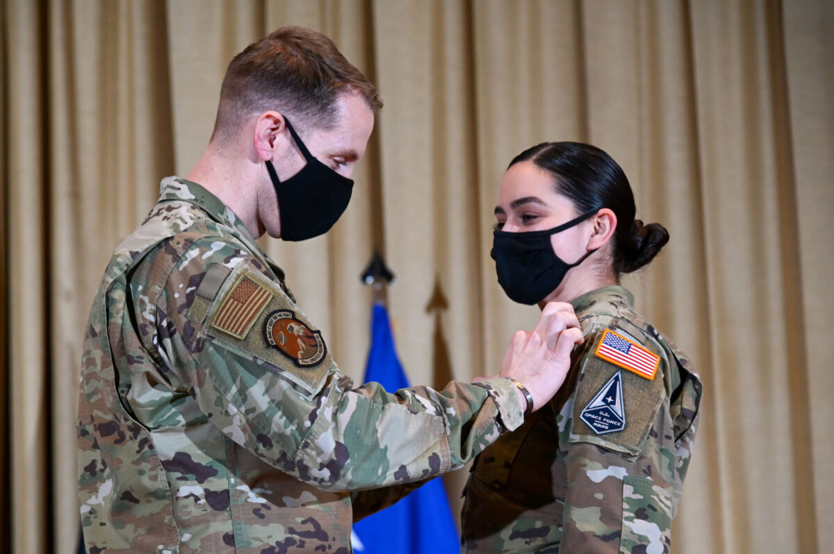 The transfer was officially commemorated by the removal of the spice brown threaded Air Force tapes and flag of the inductee’s OCP uniforms and replacement of them with Space Force blue threaded tapes and a colored flag.