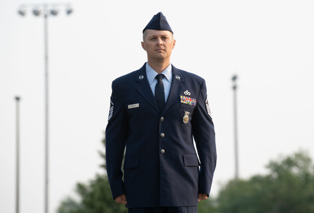 U.S. Air Force Senior Master Sgt. Chad Carrier, 419th Civil Engineer Squadron, stands at attention before being presented the Airman’s Medal at Hill Air Force Base, Utah on July 11, 2021. The Airman’s Medal is a distinguished decoration awarded to those who display heroism or acts of heroism that involve a voluntary risk of life under non-combat conditions.