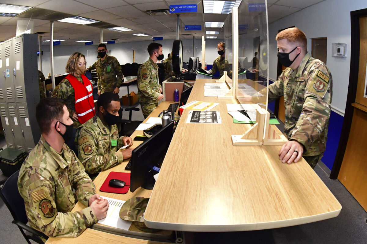 Staff Sgt. Dayztyka Kono (left), 775th Civil Engineering Squadron, processes Airman 1st Class Paola Castro, 75th Security Forces Squadron, through the mobility line during a mobility exercise May 26 at Hill Air Force Base. The exercise was to test deployment readiness of Airmen from the 75th Air Base Wing and 309 Aircraft Maintenance Group.