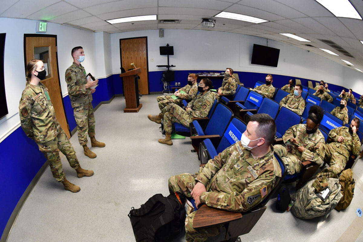 Staff Sgt. Alexander Ritsema, 75th Force Support Squadron, provides instruction to Airmen participating in a mobility exercise May 26 at Hill Air Force Base. The exercise was to test deployment readiness of Airmen from the 75th Air Base Wing and 309th Aircraft Maintenance Group.