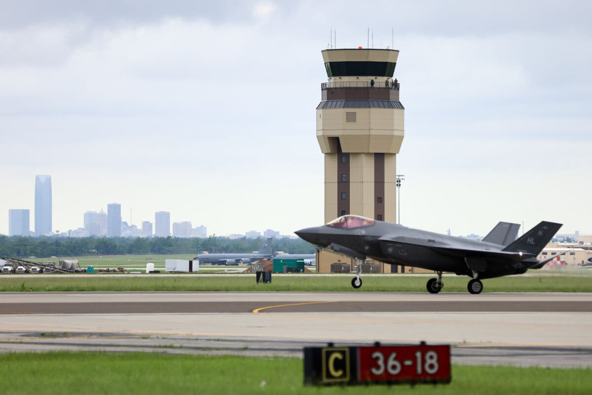 An Air Force F-35 Lightning II Demonstration Team aircraft takes off from Tinker Air Force Base, Okla., on May 25. The team visited the Oklahoma City Air Logistics Complex’s Heavy Maintenance Center to thank the men and women for their work on sustaining the F135 engine, which powers the F-35A.