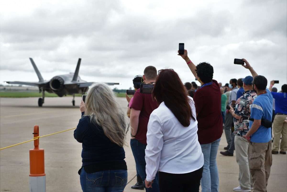 Members of the Oklahoma City Air Logistics Complex Heavy Maintenance Center take pictures as an Air Force F-35 Lightning II Demonstration Team aircraft taxis to the runway at Tinker Air Force Base, Oklahoma, May 25, 2021. The men and women of the HMC support all models of the F-35, including the Air Force, Navy and Marine Corps variants, as well as those of partner nations. (U.S. Air Force photo by Gina Anderson)