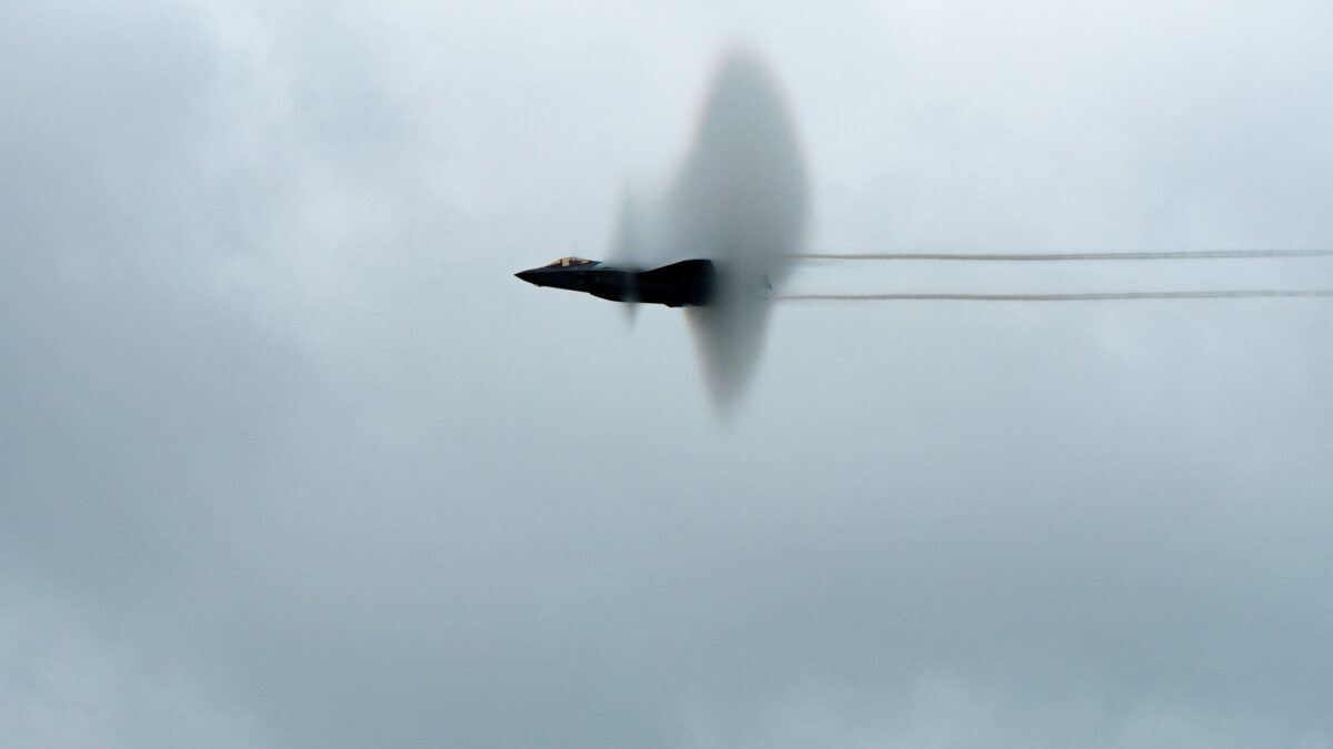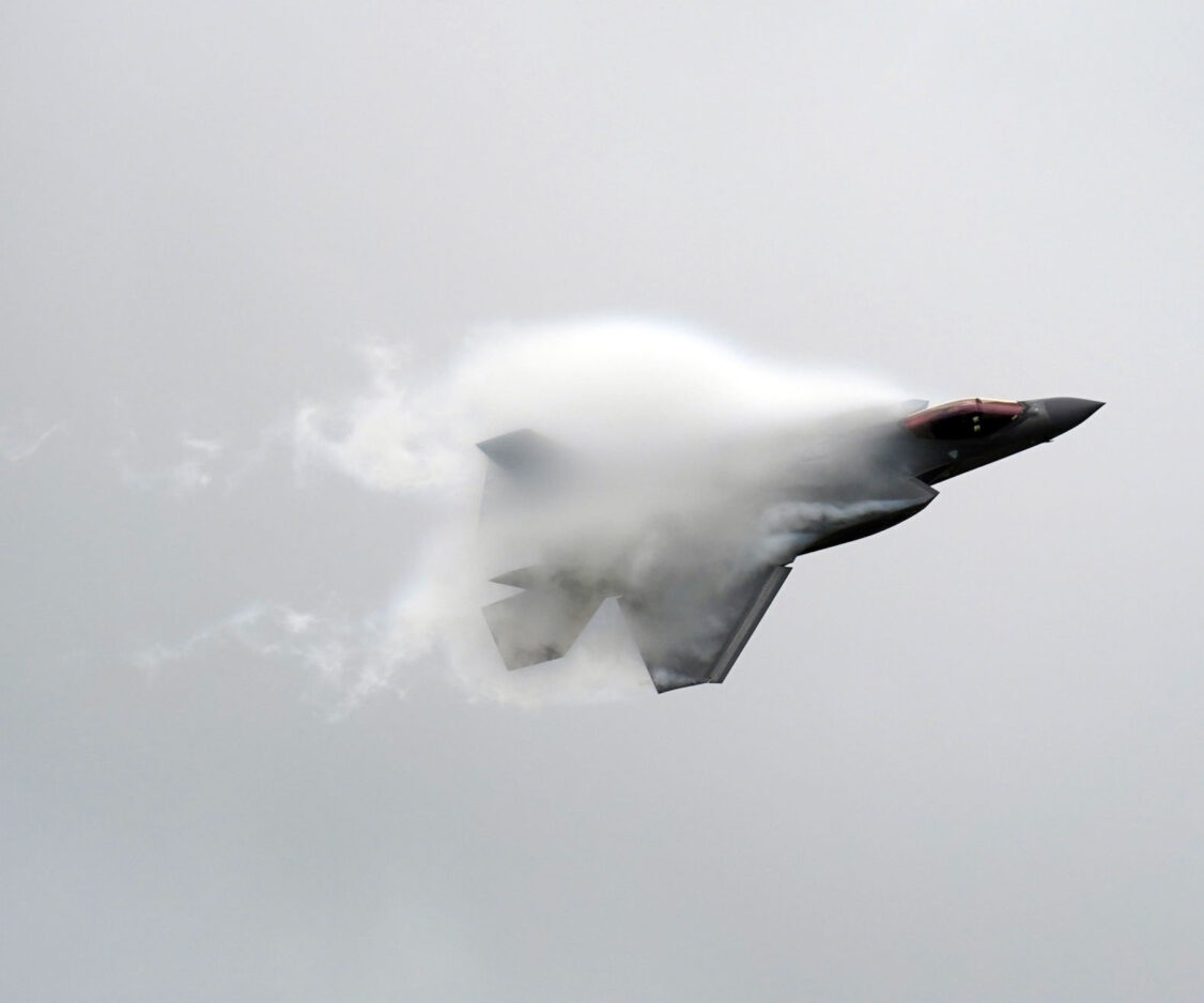 An F-35A Lightning II aircraft assigned to the Air Force’s F-35 Demo Team creates a vapor cone as it performs a demonstration flight at Tinker Air Force Base, Oklahoma, May 25, 2021. The F-35 Demo Team visited Tinker AFB to thank the maintainers of the Oklahoma City Air Logistics Complex Heavy Maintenance Center for their work on sustaining the F135 engines that power the F-35. (U.S. Air Force photo by Mark Hybers)