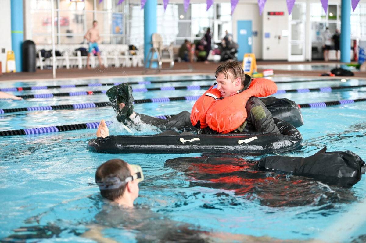 The F-35 pilots met with specialists in Survival, Evasion, Resistance, and Escape – better known as SERE – at a local indoor swimming pool near Hill AFB for a hands-on refresher course on how to survive following ejection. That included simulated parachute drags, where pilots must quickly untangle themselves from a downed canopy, and other skills such as employing personal rafts and activating emergency signals.