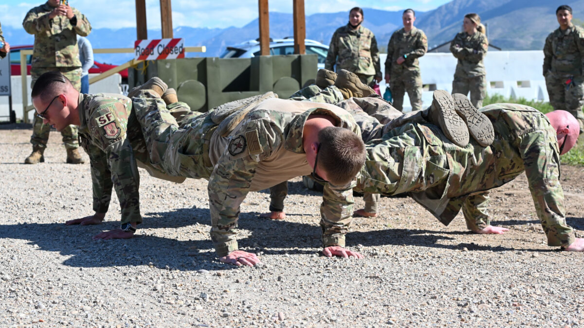 The non-commissioned officer team from the 75th Security Forces, do a four-man push-up during the National Police Week obstacle course competition, May 11, 2021 at Hill Air Force Base. The obstacle course competition was one of many events 75th SFS hosted to commemorate the week to honor the sacrifices of the law enforcement community. (U.S. Air Force photo by Cynthia Griggs)