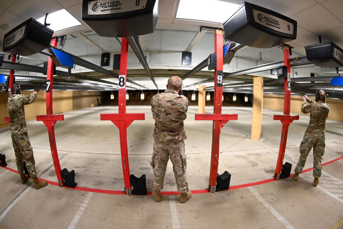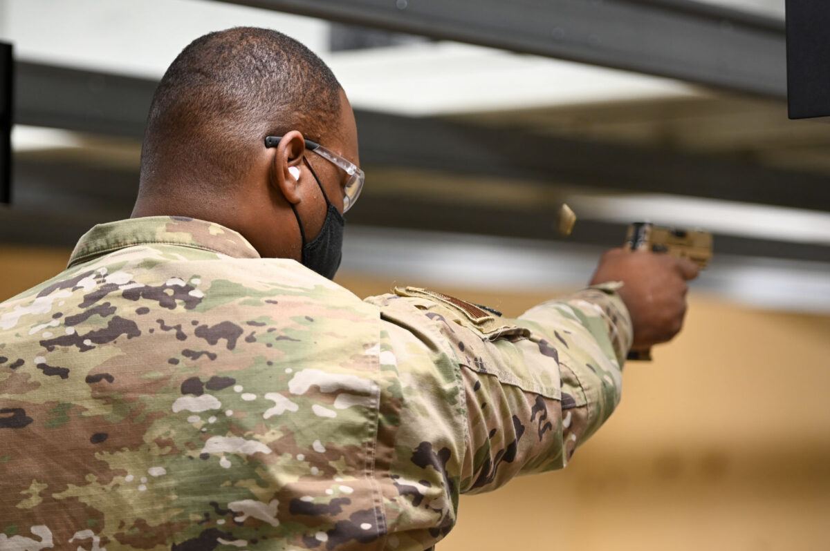 Airmen participate in the National Police Week pistol shooting competition, May 13, 2021 at Hill Air Force Base. The shooting competition was one of many events 75th Security Forces Squadron hosted to commemorate the week to honor the sacrifices of the law enforcement community. (U.S. Air Force photo by Cynthia Griggs)
