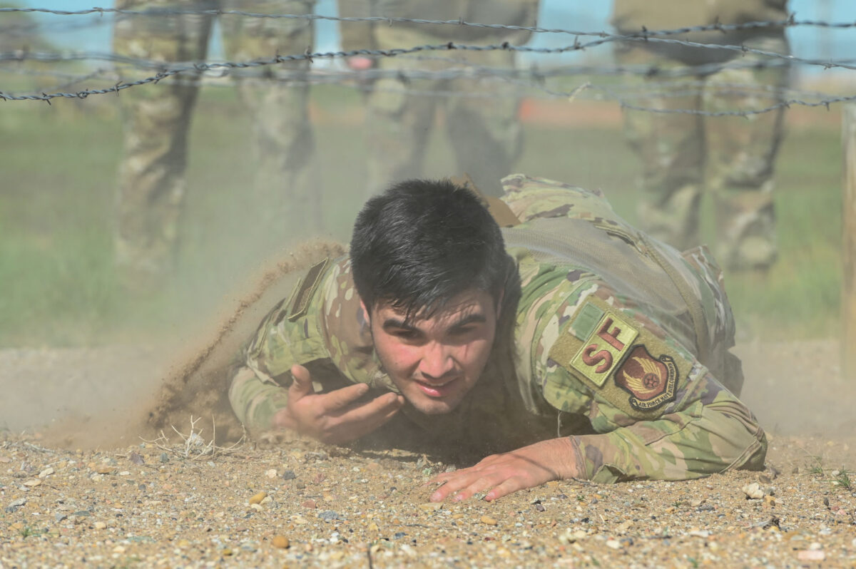 Airman 1st Class Wyatt Ramos, 75th Security Forces Squadron, crawls under barb wire during the National Police Week obstacle course competition May 11 at Hill Air Force Base. The obstacle course competition was one of many events 75th SFS hosted to commemorate the week to honor the sacrifices of the law enforcement community.