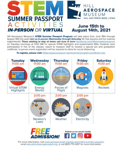 HILL AIR FORCE BASE — For the fourth consecutive year, the Hill Aerospace Museum offers its free STEM Summer Passport Program with a variety of unique and engaging classes for children ages seven and older. Classes continue through Aug. 14.Classes include lessons on energy, Newton's laws, ...