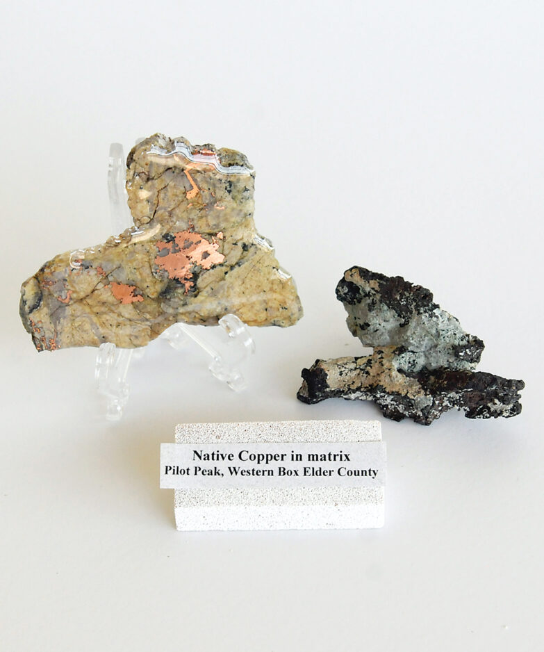These mines in the west desert produced primarily copper, and those north of Grouse Creek produced silver and other fine metals. One of Cefalo’s striking samples from the Pilot Range shows little ribbons of bright copper “rutilated,” or running through, a piece of quartz.