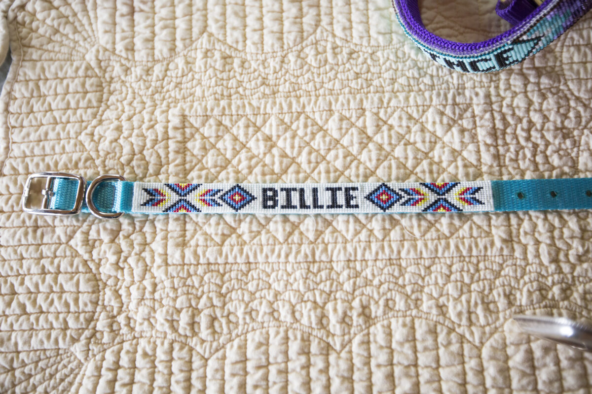 She looked at several beaded objects, then decided to take the plunge. Her first attempts “were horrid,” but she persisted and was able to make personalized dog collars as Christmas gifts for their friends. She hand-sewed the personalized beaded collars onto pre-made regular nylon dog collars.