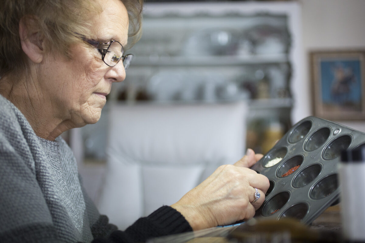 Madsen picks up the miniscule beads out of the muffin tin with a needle that is attached to a long thread, which she then weaves through threads, called the warp, strung on the board.