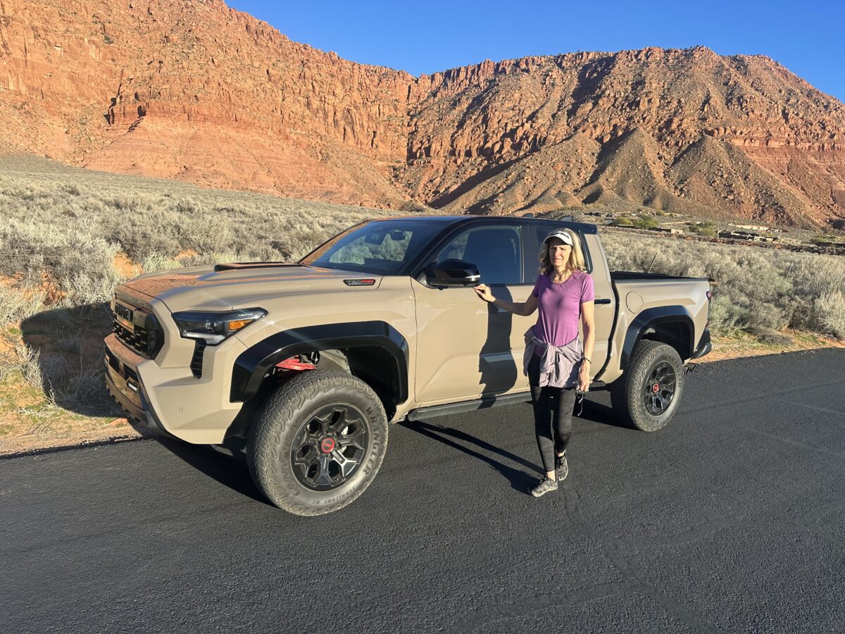 Deanne stands with the redesigned 2025 Toyota Tacoma TRD Pro, finished in the rugged Mud Bath/Black color, which proved to be the ideal adventure vehicle for a sunny Thanksgiving getaway to St. George.