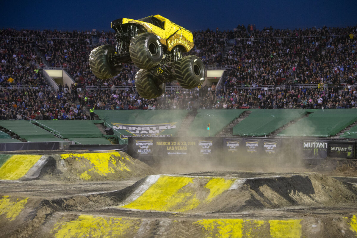 Earth Shaker, the monster truck driven by Tristan England, gets huge air off a jump in this photo. England will be in this weekend’s Triple Threat events at Vivint Smart Home Arena.