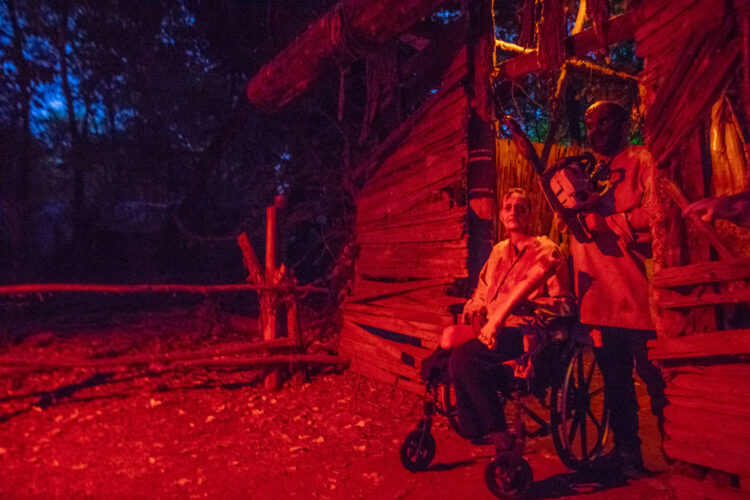 Steven and Brigitte Silcox pose for a portrait outside of their shack before visitors arrive at the Haunted Hollow in West Haven on Friday, Sept. 28, 2018.