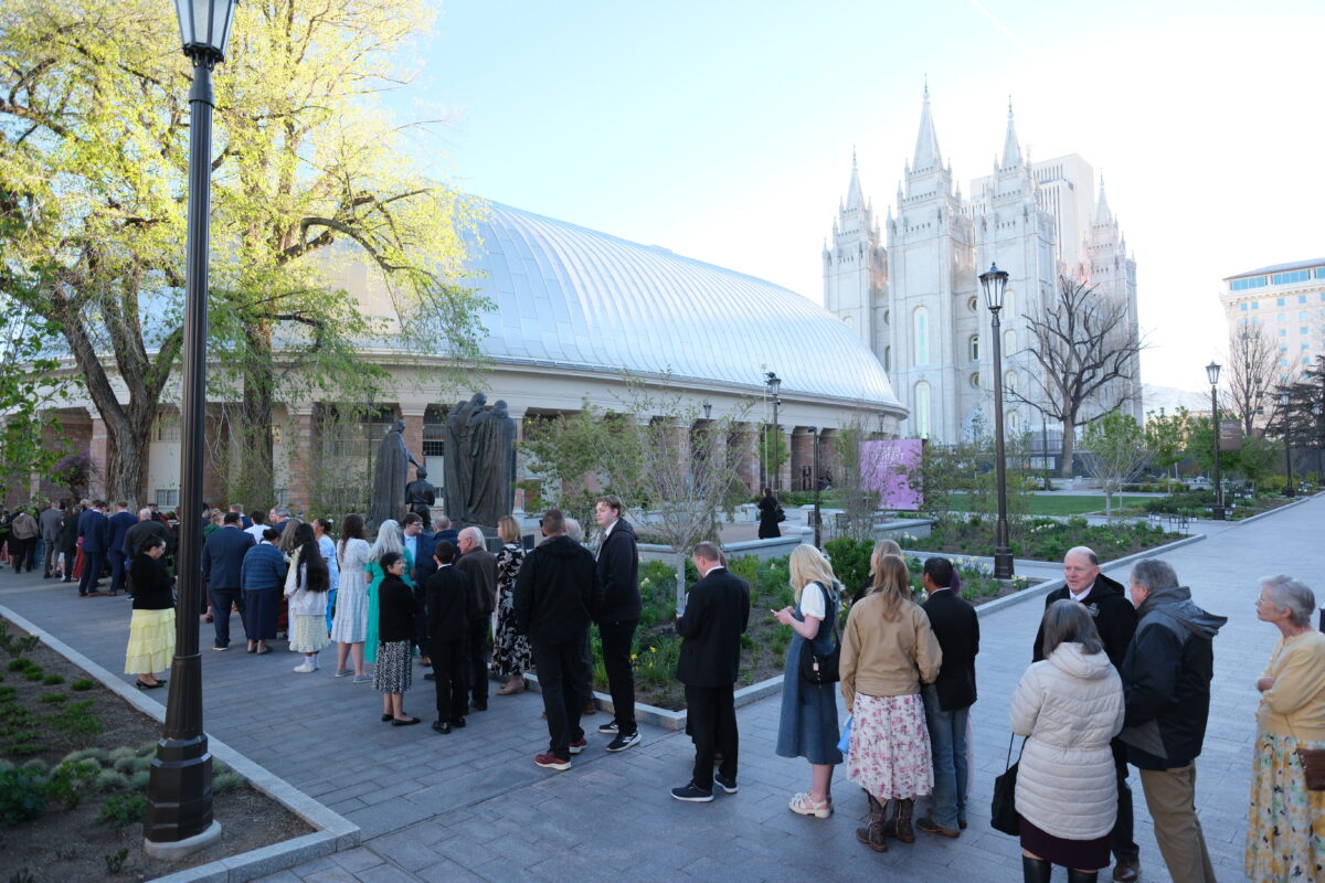 People line up for the 196th Annual General Conference of the The Church of Jesus Christ of Latter-day Saints on Sunday, April 5, 2026.