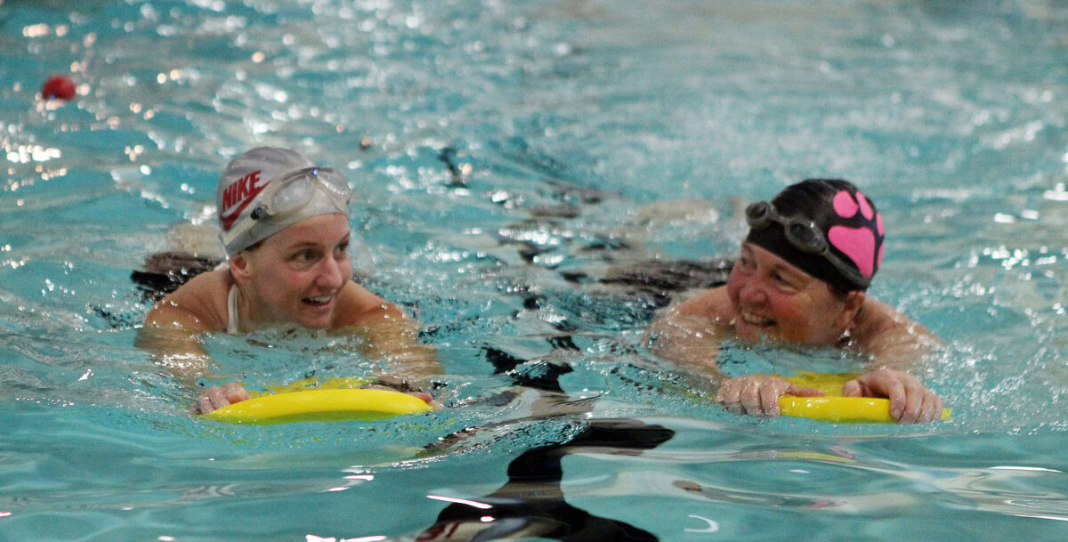 Swim instructor Cindy Taylor, black cap, and Annie Frye, grey cap, take a break from freestyle laps and talk during a swimming session at the Roy City Recreation Center Friday, May 9, 2014. (BRIAN NICHOLSON/Special to the Standard-Examiner)