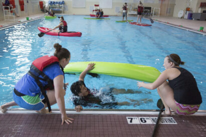 Weber State University physical education majors Zuleika Grinsell, left, and Madi Campbell, right, laugh with Ogden High School sophomore Alfredo Munoz as he loses his balance getting on a kayak during an outdoor skills gym class in the Swenson pool at Weber State University in Ogden on Monday, March 21, 2016.
