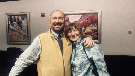 Freeride skier Wynter McBride (right) poses for a photo with her father, Mike McBride, after talking to the editorial board at the Standard-Examiner in Ogden on Wednesday, March 11, 2026.