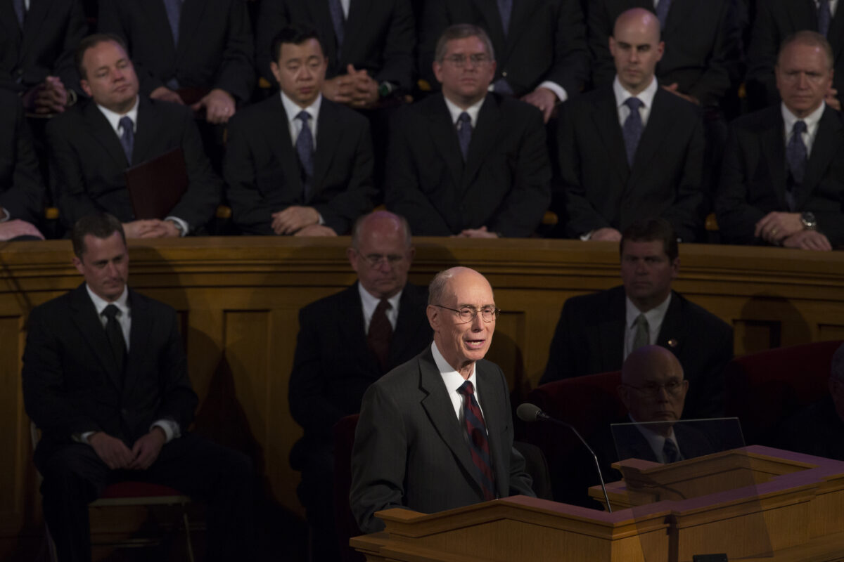 President Thomas S. Monson, of The Church of Jesus Christ of Latter-day Saints, attends the memorial service for Mormon leader Boyd K. Packer at the Tabernacle, on Temple Square Friday, July 10, 2015, in Salt Lake City. Packer’s death on July 3 at the age of 90 from natural causes left the religion with two openings on a high-level governing body called the Quorum of the Twelve Apostles. (AP Photo/Rick Bowmer)