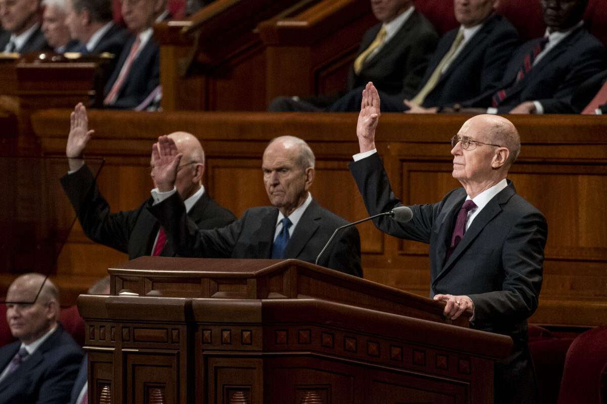 Nelson’s counselors in the First Presidency are Dallin H. Oaks as first counselor and Henry B. Eyring as second counselor. They were also sustained Saturday.