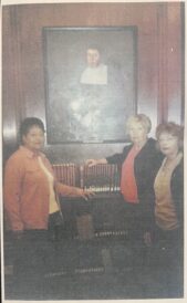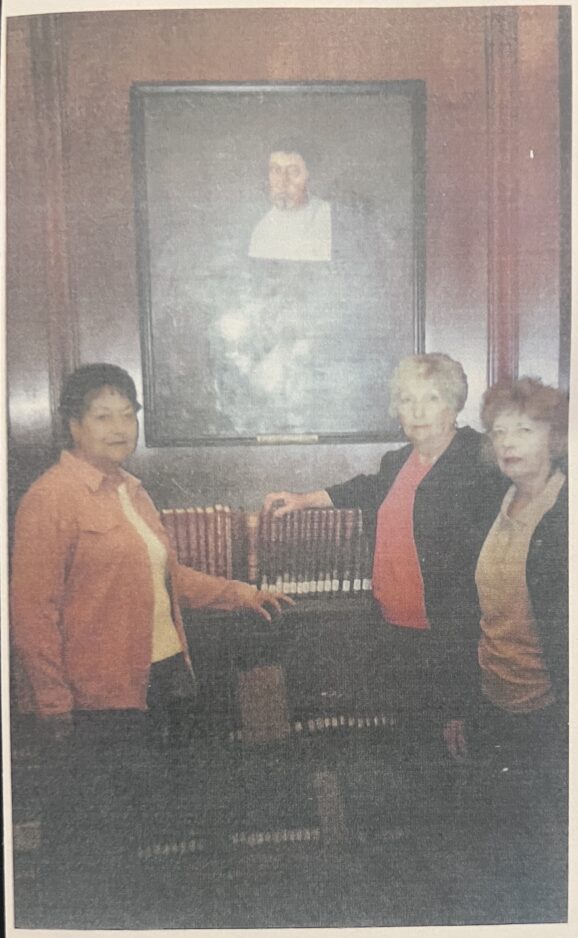 - Joanne Fae Wheeler Blanch, Verla Wheeler Murray and Colleen Earl pose for a photo next to a painting of Edward Rawson in the New England Genealogical Society Building in Boston.