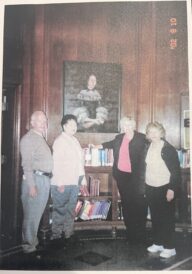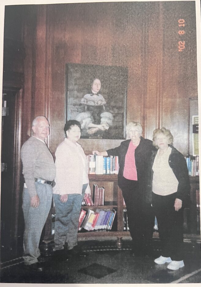- Larry Blanch, Joanne Fae Wheeler Blanch, Verla Wheeler Murray and Colleen Earl pose for a photo next to a painting of Rebecca Rawson in the New England Genealogical Society Building in Boston.