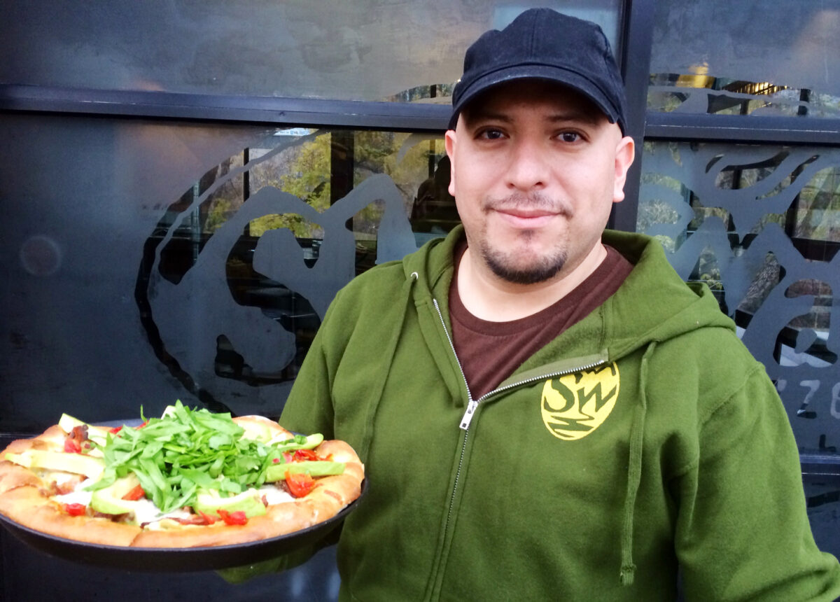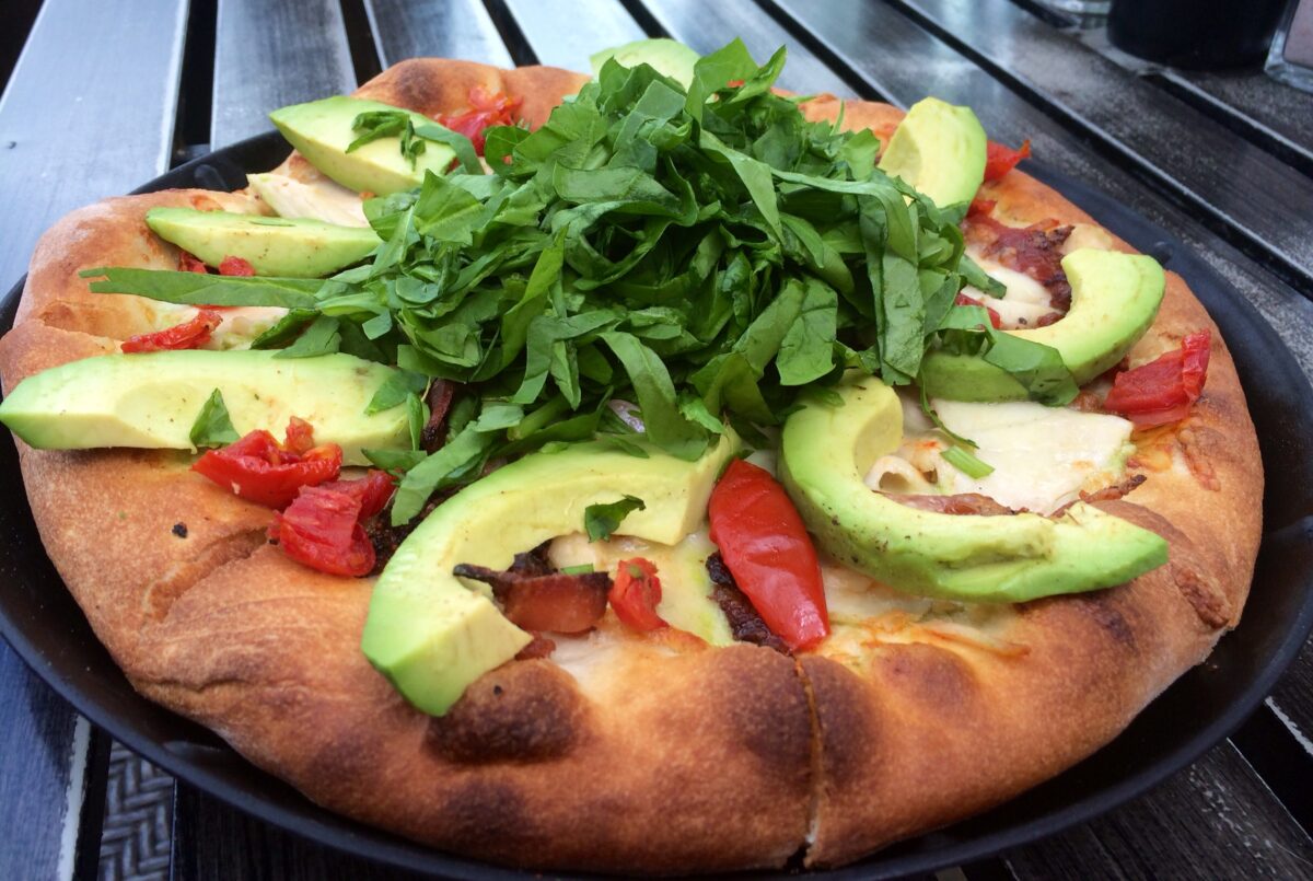 One of the restaurant’s top-selling pizzas is the California Sunrise –a cilantro-basil ranch sauce, chicken and bacon. After baking, it’s topped with avocado slices, and thin ribbons of raw spinach.