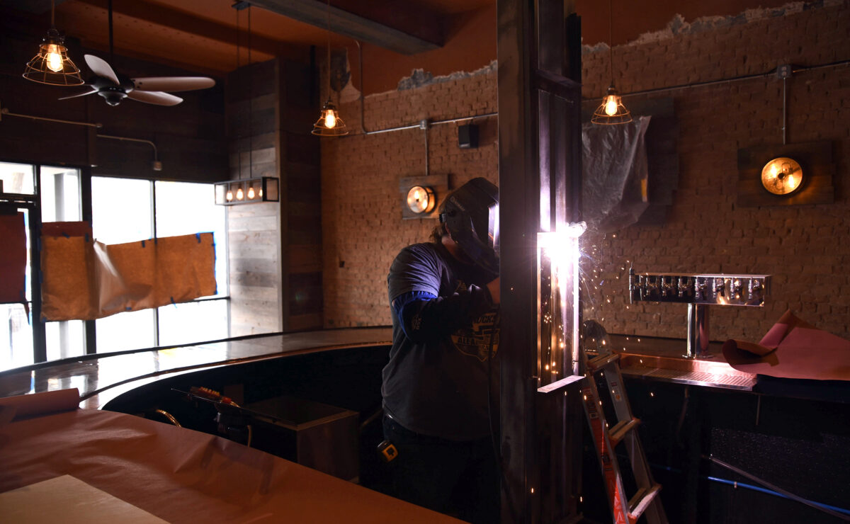 Brett Jensen works on welding liquor shelves Saturday, Jan. 7, 2017, at the future location for gastropub Harp and Hound in Ogden. Co-owners Dave Morris and Bridget Gordon hope to open the new business, located above their bar Funk ‘n Dive, in the next week.