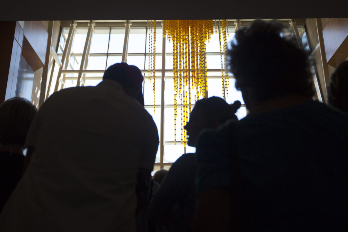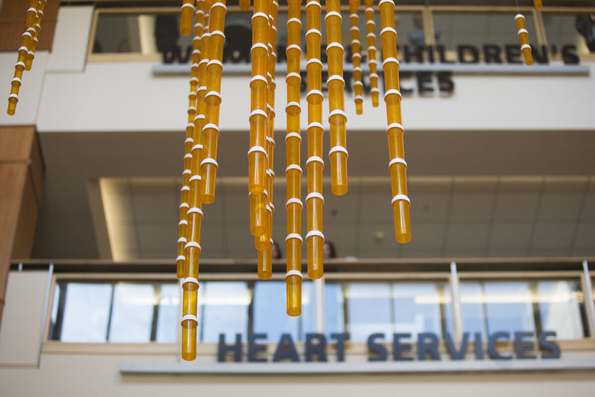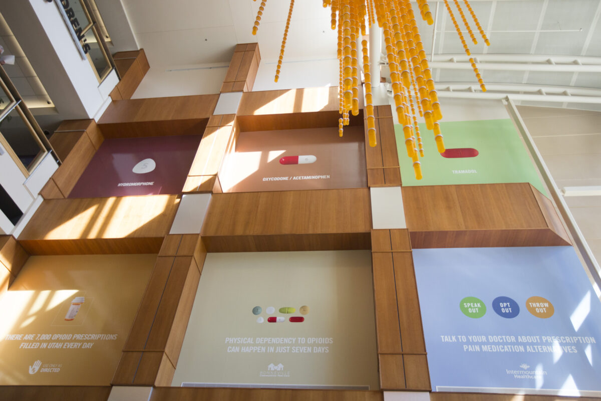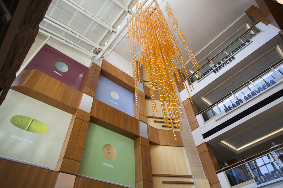 On Wednesday morning, Aug. 31, Young’s art was displayed above attendees at the main entrance of McKay-Dee Hospital in Ogden. The art piece includes 7,000 pill bottles.