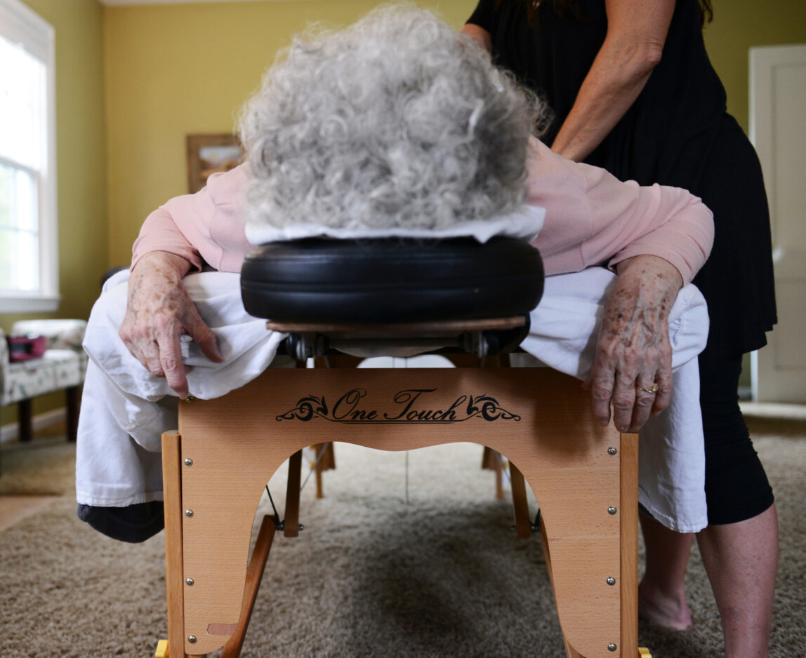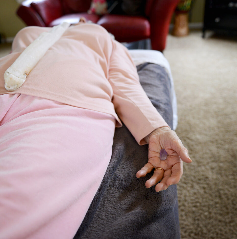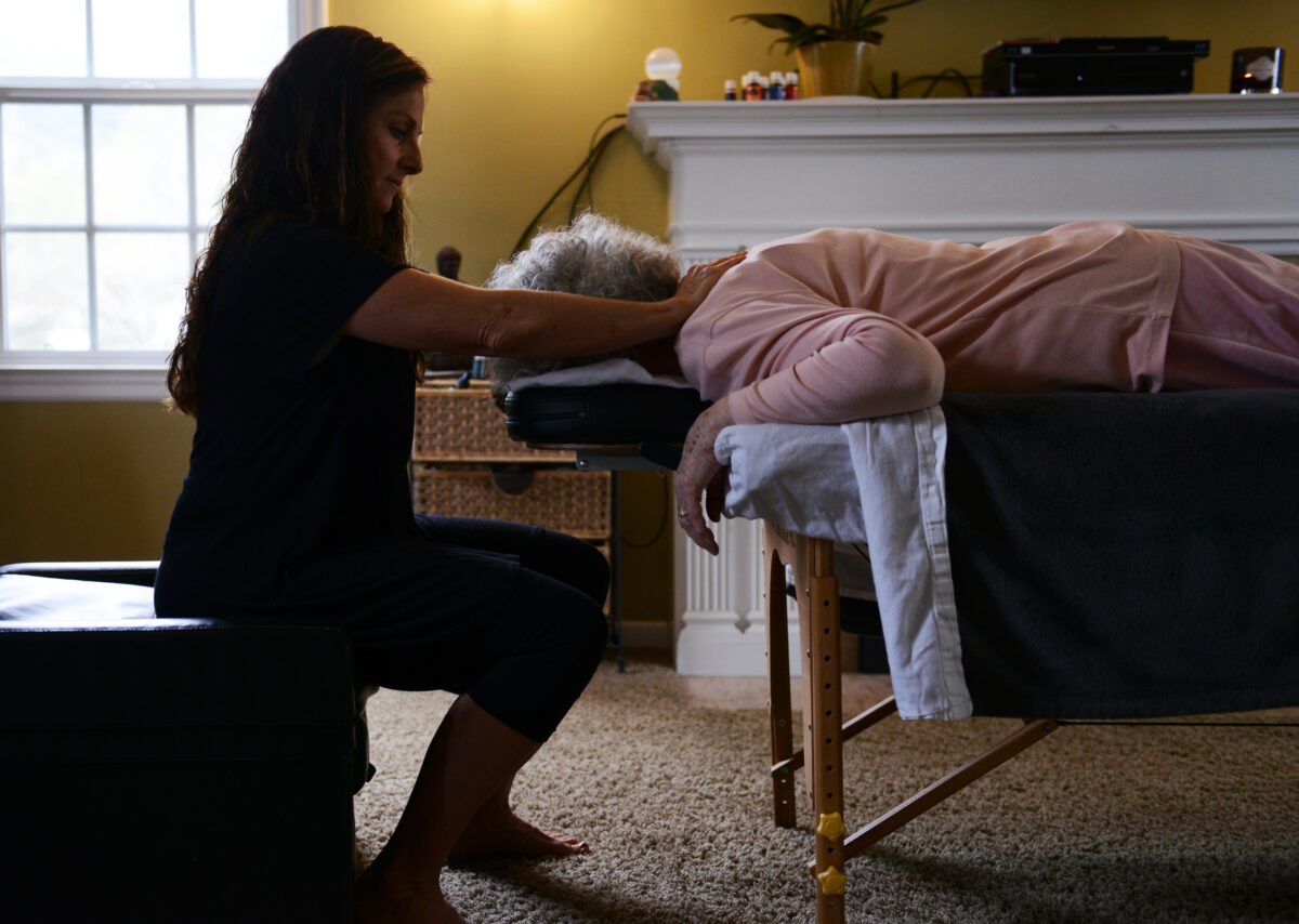 Rosemary Hyde works on Renee Gushen during a Reiki session at her home in Ogden on Tuesday, April 26, 2016.