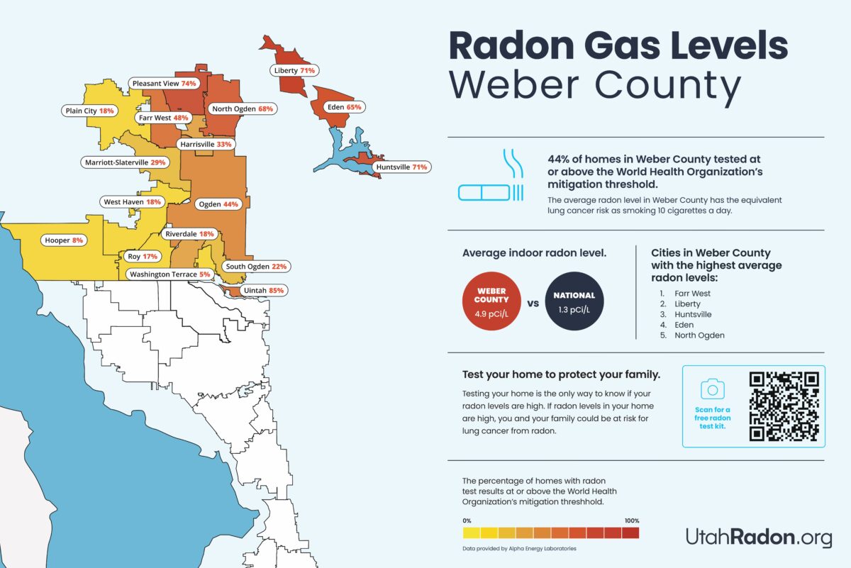 - A chart shows percentage of radon levels in Weber County cities that are above the healthy level.