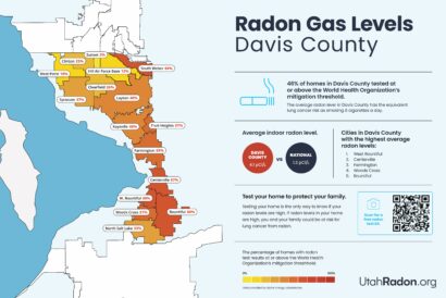 - A chart shows percentage of radon levels in Davis County cities that are above the healthy level.