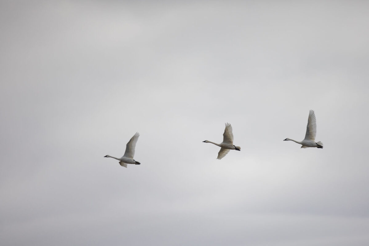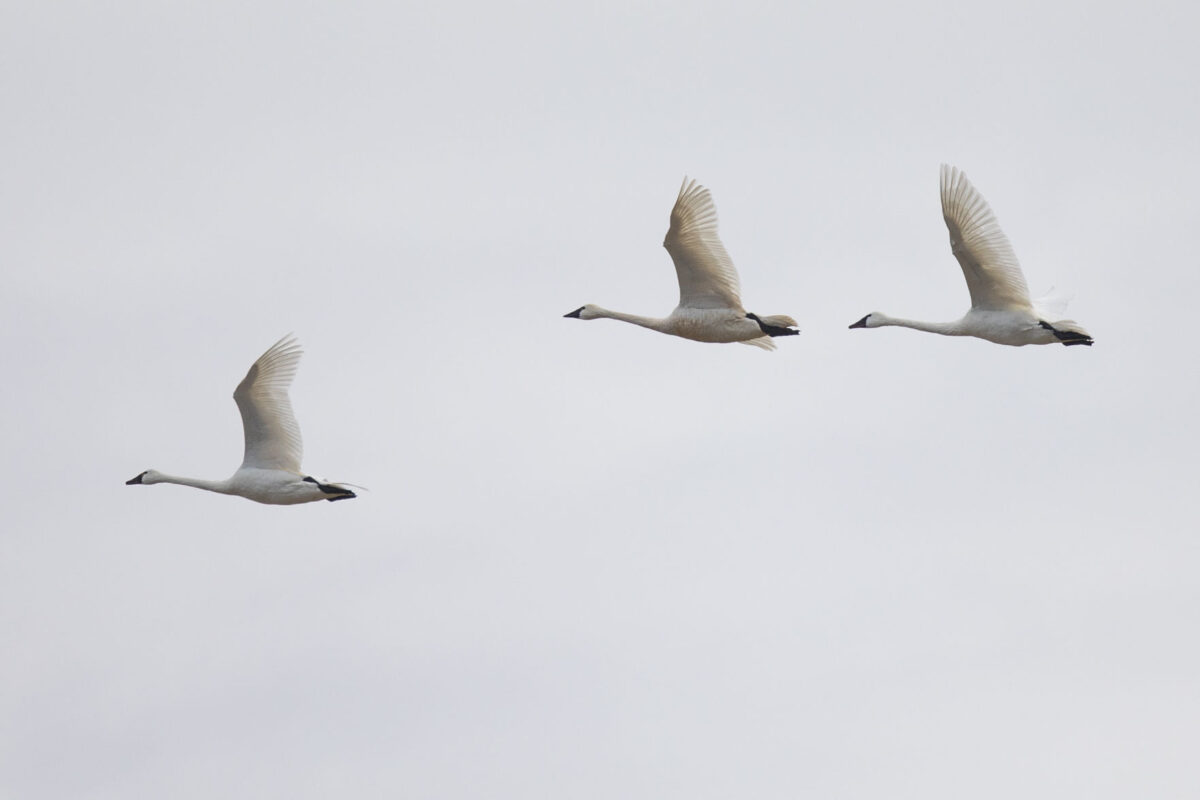 Trumpeter swans are significantly larger than tundra swans and are the largest waterfowl species in North America, with wingspans exceeding 8 feet. Trumpeter swans also do not have a yellow-colored spot near their eyes — which is a defining characteristic of tundra swans — and trumpeter swans make a distinctive trumpet-like sound, hence their name. Their spring migration takes them from wintering grounds in California to nesting sites in Canada and Alaska.