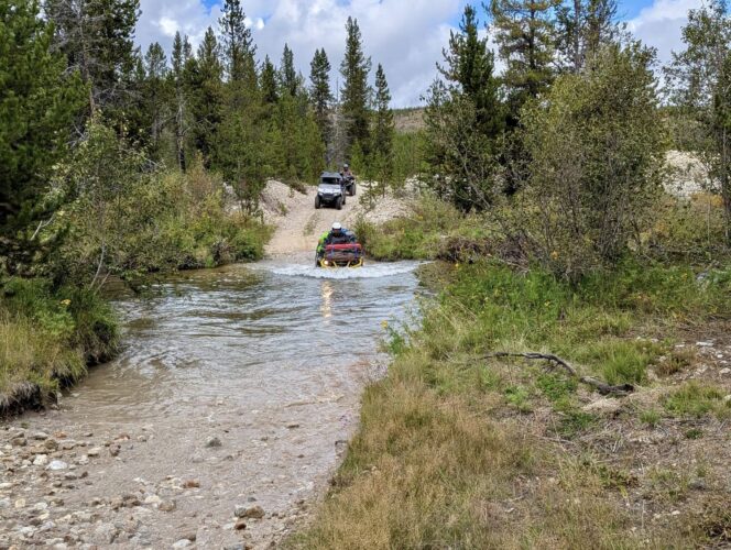A water crossing, one of several that highlighted the trip.When we left the Idaho travelers, they were five days into their adventure from Clark Fork, near the Canadian border, to Mountain Home, a day off-schedule, and camped on the side of a forest service road. They had faced road closures due to an active forest fire, been attacked by a cow moose, and had one rider drop out with a dead RZR.