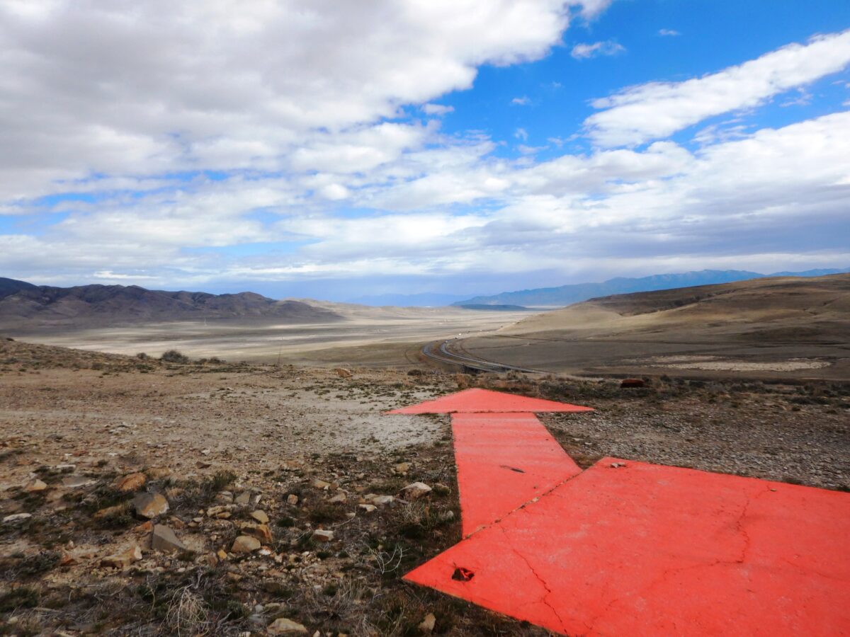 There are 11 of these arrows that still exist, located throughout Utah. The airmail route was marked by rotating red beacon lights mounted on 51-foot towers, visible at night. The towers were set on concrete arrows, 50 to 70 feet long and 11 feet wide, painted school-bus yellow, and pointing to the next beacon, roughly 10 miles away. They were designed to be visible from the air at an altitude of 3,000 feet. This one was painted orange.
