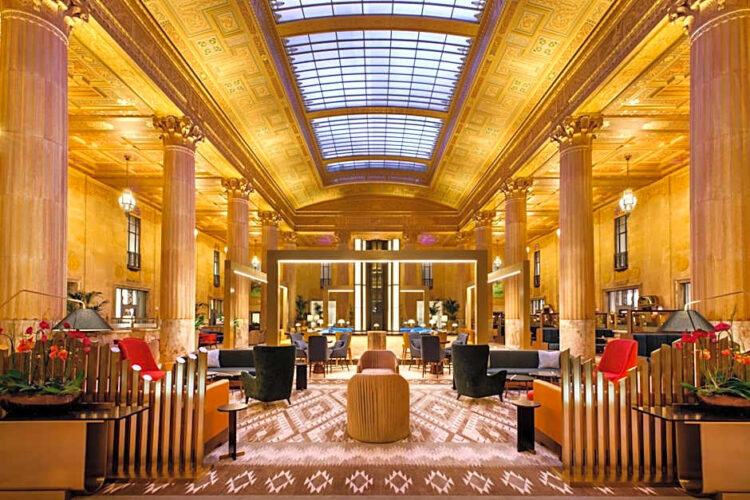 The hotel lobby of The National in Oklahoma CityOklahoma is known for a lot of things. Food isn’t one of them.