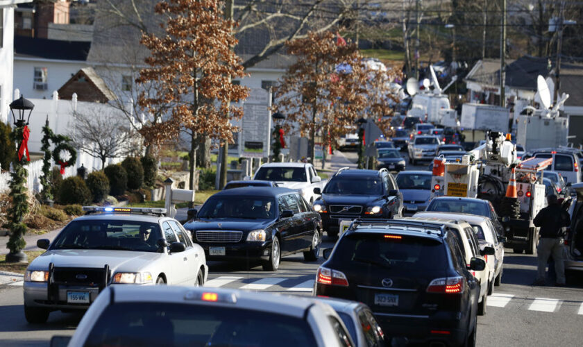 NEWTOWN, Conn. — A single bell repeatedly rang a sad, slow beat Thursday at the Connecticut funeral of a 6-year-old girl killed by a gunman at her elementary school, while a cardinal in New York compared a slain teacher to Jesus for giving up her life to protect others.In Newtown, the site of ...