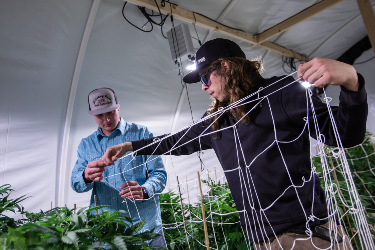 True North cultivators Tony Hernandez, right, and Kendle Gibson put netting around cannabis plants at the grow facility on Thursday, Jan. 30, 2020, in Northern Utah. As buds develop on the plants the nets will help support their weight. The medicinal plants will supply several pharmacies in the state.