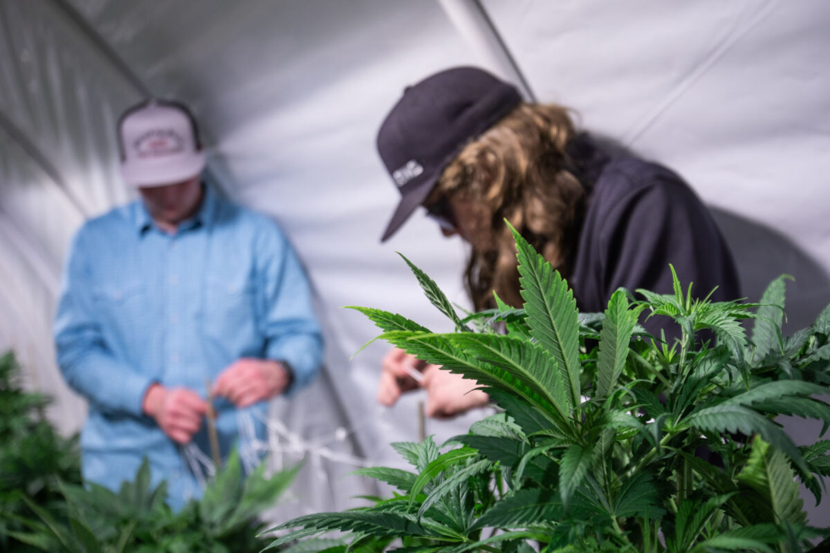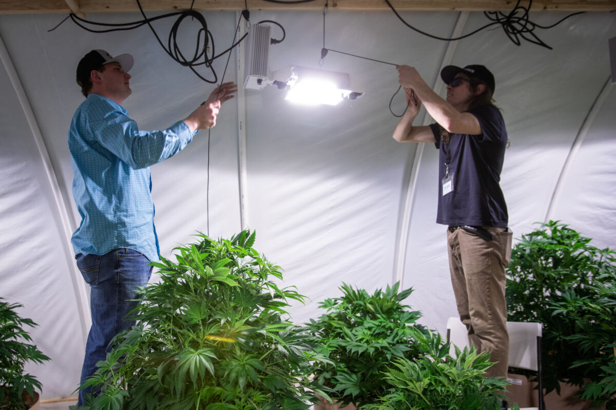 True North cultivators Tony Hernandez, right, and Kendle Gibson adjust a light over cannabis plants at the grow facility on Thursday, Jan. 30, 2020, in Northern Utah. The medicinal plants will supply several pharmacies in the state.