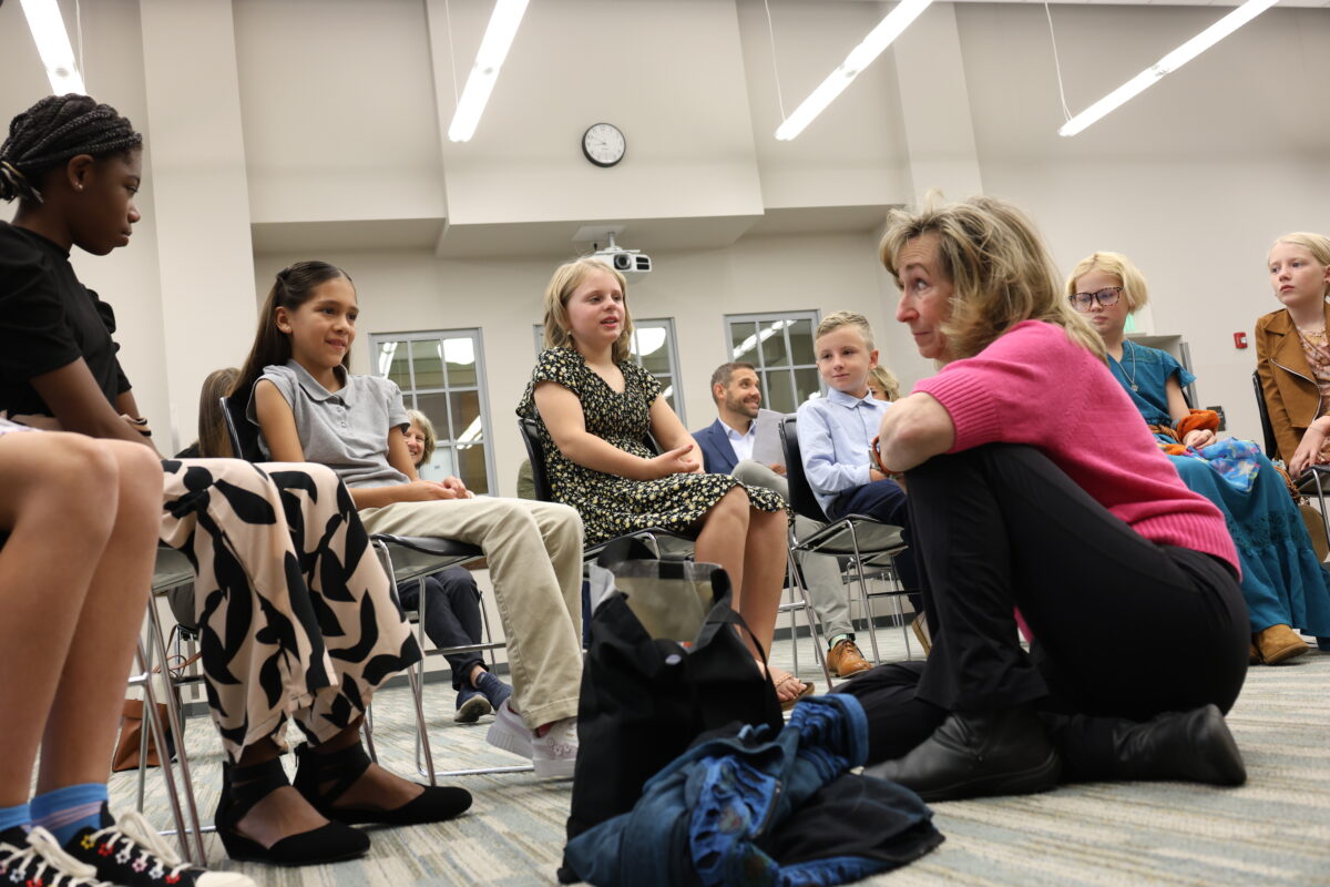 Author Sy Montgomery, pink shirt, speaks with fifth- and sixth-grade essay contest winners as part of the Ogden School District Foundation's Fall Author Event on Friday, Oct. 3, 2025.