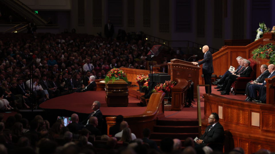 President Dallin H. Oaks of the Quorum of the Twelve Apostles speaks at the funeral services of President Russell M. Nelson at the Conference Center in Salt Lake City on Tuesday, Oct. 7, 2025.