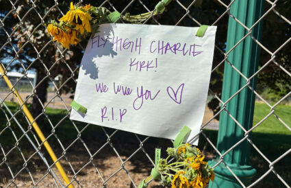 - A sign reading “Fly High Charlie Kirk! We love you. R.I.P.” is seen hanging on a fence with flowers across the street from the Utah Valley University campus in Orem on Thursday, Sept. 11, 2025.