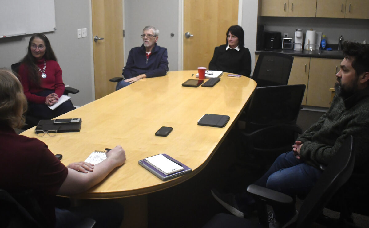 - (Clockwise from left) Roy city council member Diane Wilson, Roy city council member Bryon Saxton, Roy Mayor Ann Jackson, Roy city manager Matt Andrews and Standard-Examiner reporter Rob Nielson discuss issues at an editorial board meeting in Roy on Thursday, Jan. 29, 2026.