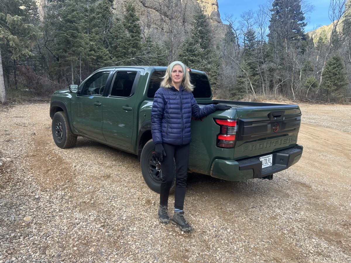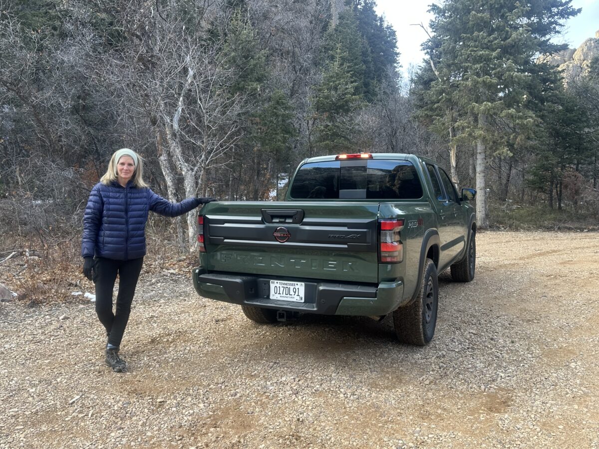 The 2026 Nissan Frontier Pro-4X looks right at home against a winter backdrop with Deanne in her winter hiking garb. The striking Tactical Green paint color provides a sophisticated, capable look that fits the Utah landscape perfectly.