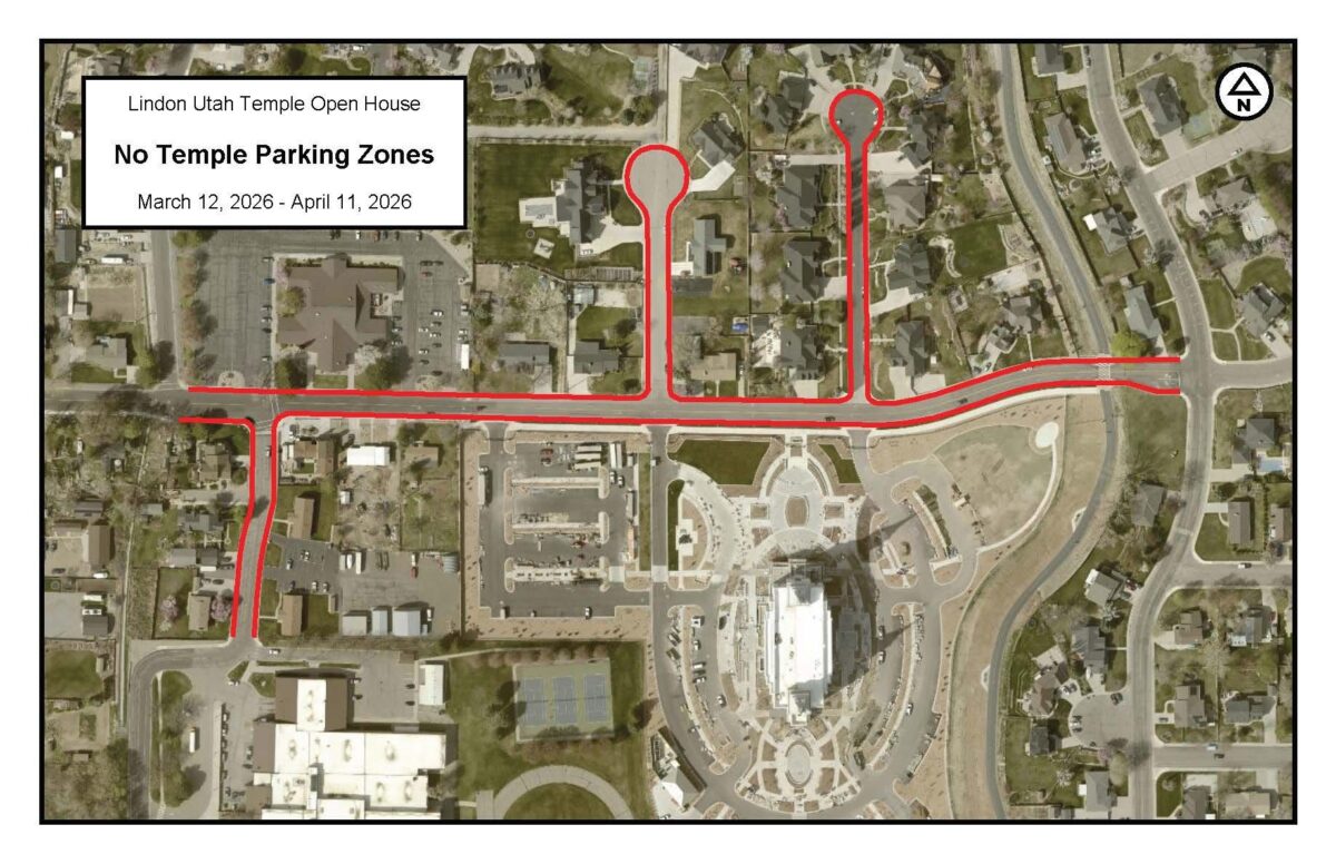 - Lindon’s no parking zones for the temple open house dates are shown.